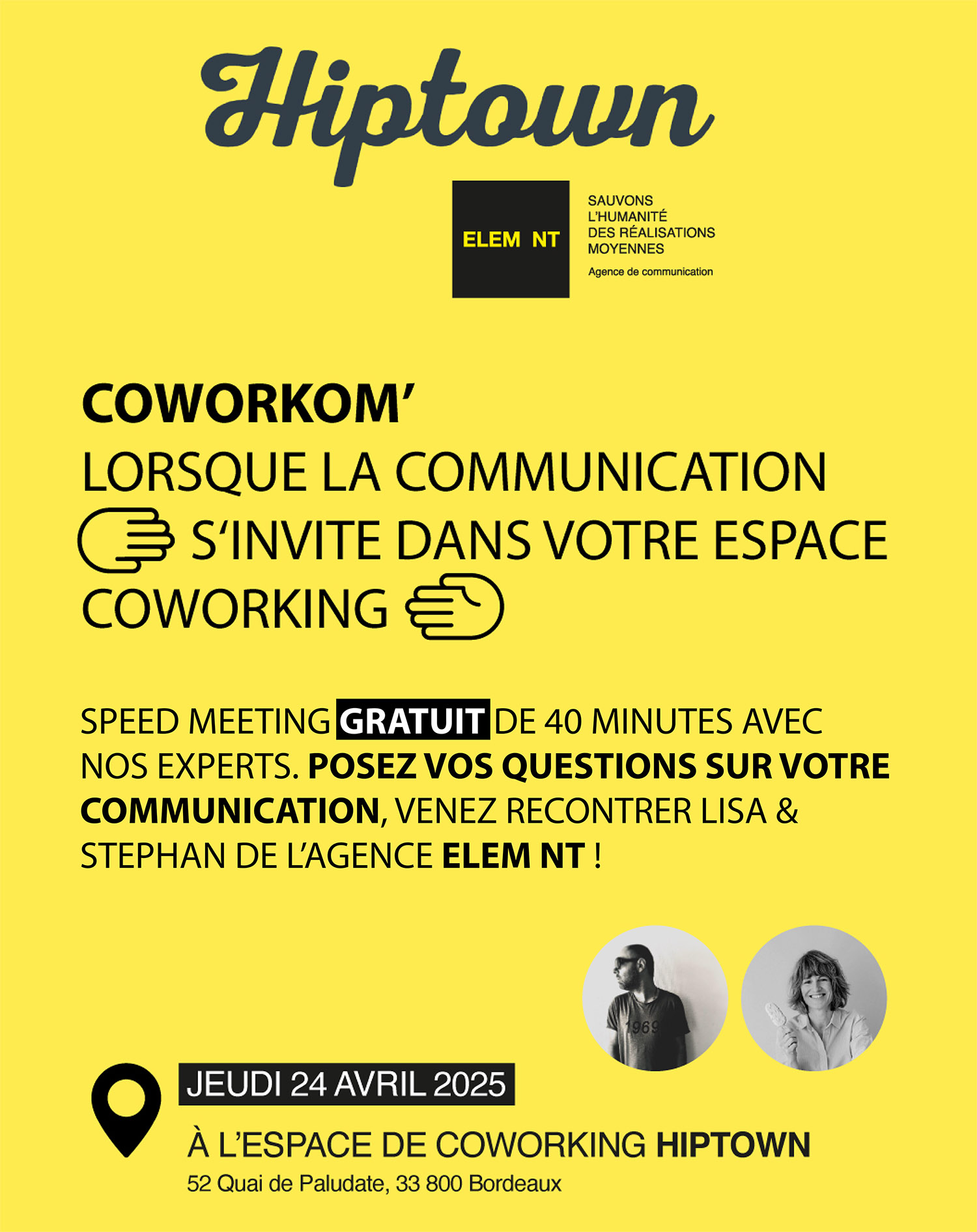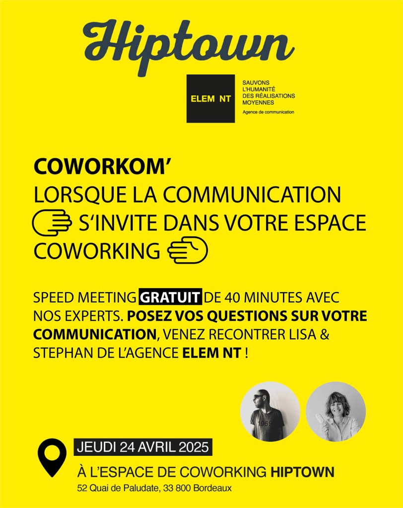 Le 24 avril 2025, L’agence de communication ELEM NT et l’espace coworking HIPTOWN tous deux situés à bordeaux, ont réalisé leur première matinale de SPEED MEETING appelée COWORKOM et qui a permis à 5 entreprises et marques d’être conseillées par l’agence sur leurs stratégies et problématiques de communication.